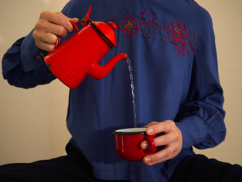 Blusa con ramo di melograno ricamato con filo rosso su viscosa blu, indossato da Irene Lombardi.