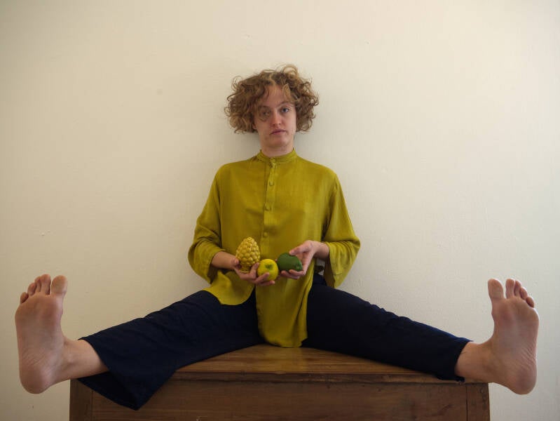 Camicia in viscosa plissé giallo curry e colletto alla coreana, indossato da Irene Lombardi.